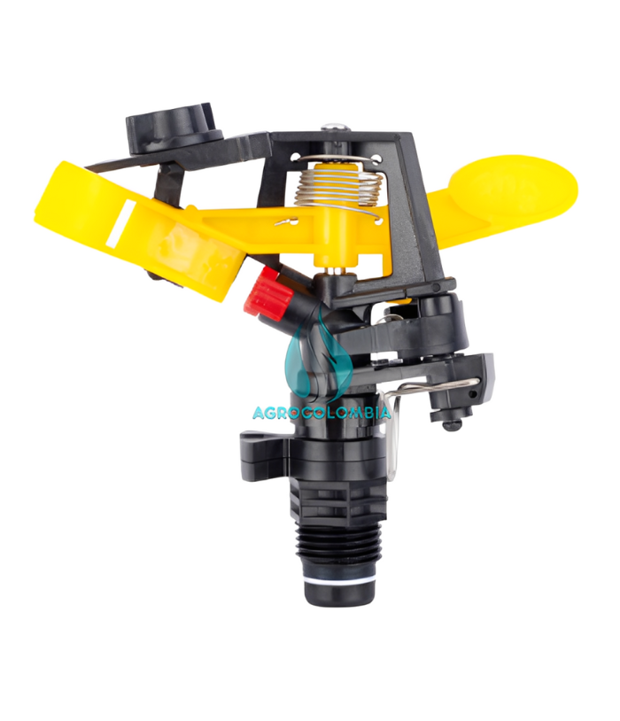 Aspersor plástico con entrada macho de 1/2″ y dos salidas con boquillas. Ideal para riego uniforme en jardines y cultivos.