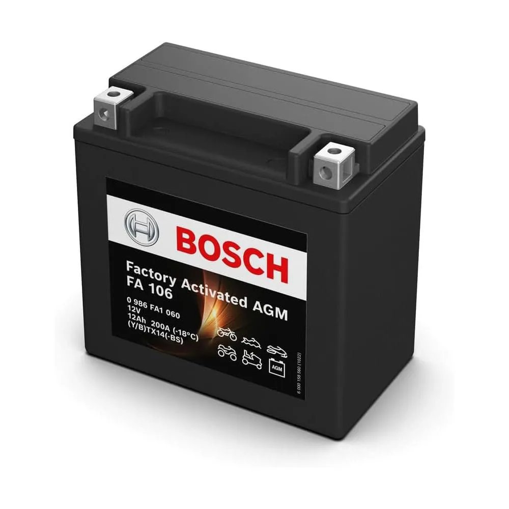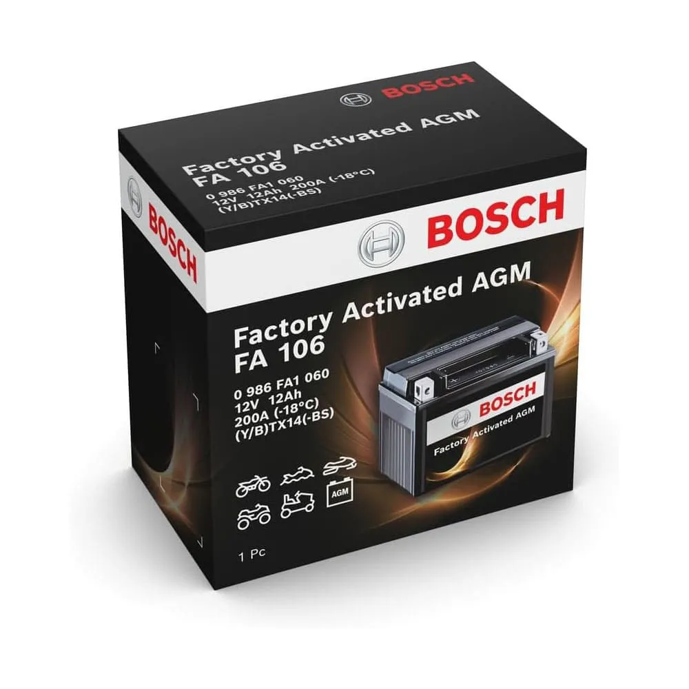 La batería de moto Bosch FA106 AGM ofrece una gran potencia de arranque. Gracias a la tecnología AGM estas baterías son muy resistentes a todo tipo de vibraciones, lo que las hace perfectas para aplicaciones de deportes de motor. Cuando las baterías AGM para moto o quad marca Bosch son sometida a bajas temperaturas extremas, ofrecen una especial resistencia a descargas y un rendimiento ampliamente mejor del arranque en frío que el resto de baterías de moto convencionales del mercado.