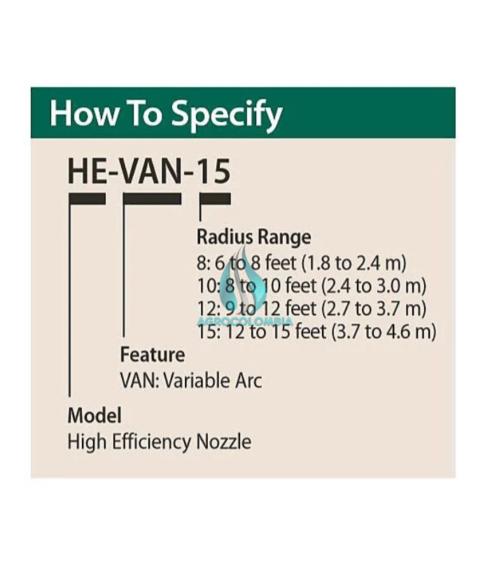 - > Las toberas HE-VAN tienen un patrón de chorro exclusivo, diseñado para una cobertura superior y resistencia al viento.