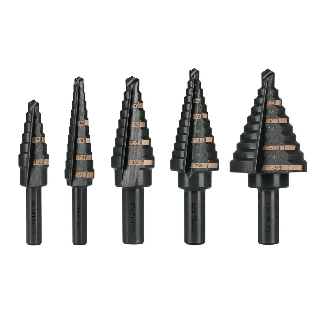 La broca escalonada Truper posee el diámetro marcado en láser de larga duración para identificar rápidamente el tamaño a perforar, es ideal para hacer perforaciones en plástico y metal.