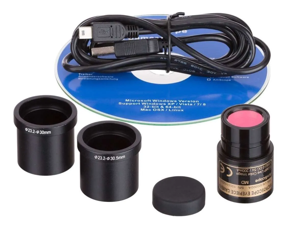 Esta cámara de microscopio digital de 1,3 MP tiene un diseño único que incluye un cable USB y dos adaptadores. La cámara digital capta todavía secuencias de imágenes, de videos en vivo en sus computadoras, y es compatible con Windows XP / Vista / 7/8/10, Mac OS X, y Linux. El software fácil de usar para Windows ofrece funciones avanzadas que incluyen costura, EDF (Extended Profundidad de enfoque), y la grabación de video. Vídeo en directo y todavía captura de imagen se pueden ajustar en diferentes modificaciones simultáneamente. Usted puede editar y analizar imágenes en una manera similar a un Photoshop. El software le permite hacer notas, formas y marcas con facilidad. Usted puede analizar, presentar y compartir imágenes de muestras y especies utilizando el software. Con su fácil instalación, todo lo que necesita hacer es deslizar la cámara en su tubo ocular en el microscopio y enchufe el cable USB de la cámara para el puerto USB 2.0 de su computadora. Con dos adaptadores, nuestra cámara se puede conectar a cualquier instrumento con un puerto de fotos 23 mm, 30 mm o 30,5 mm. La cámara está equipada con un sensor de color CMOS con un manual de instrucciones en el software. En el paquete especificado la cámara, un cable de USB 2.0 de alta velocidad, y dos adaptadores. Estamos actualizados en los Estados Unidos y todas nuestras cámaras vienen con una vida de actualizaciones de software. Que llegue Nueva marca en una caja sellada de fábrica.