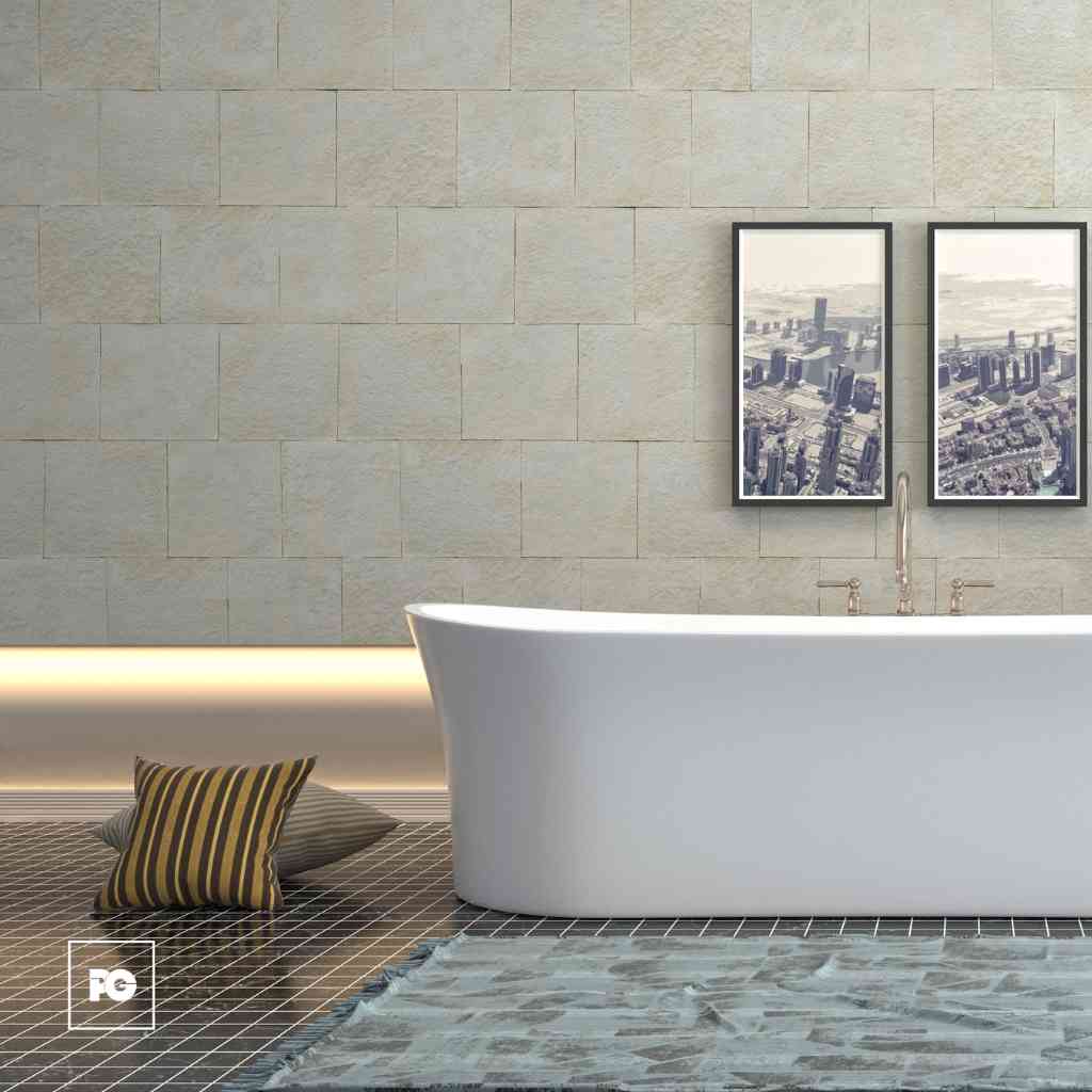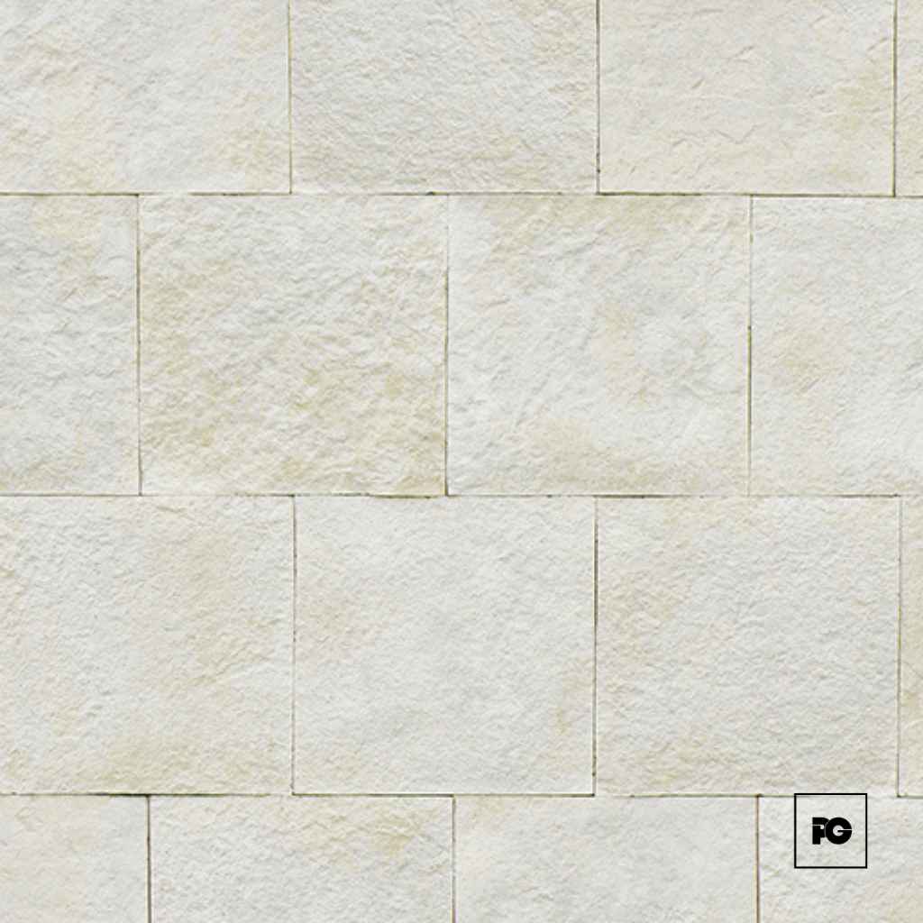 Fachaleta marca Perdura Stone medida máxima 33.2 cm de largo x 33.2 cm de alto color blanco. Con una caja se cubre 1.10 metros y cada caja contiene 10 piezas.