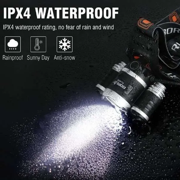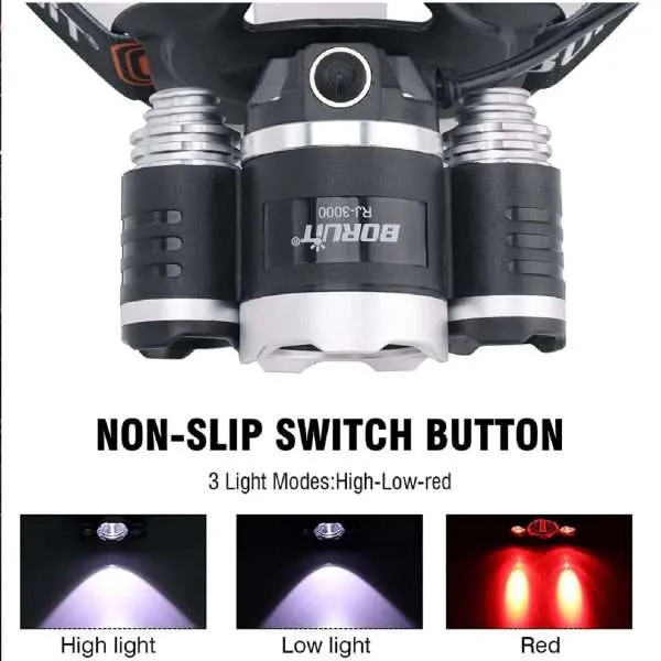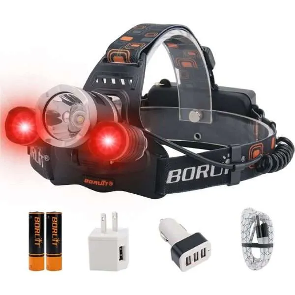 Linterna de cabeza BORUIT: Equipado con luz blanca principal LED XML-T6, hasta 5000 lúmenes y XR-E R2 2 luces laterales LED, 2 baterías recargables, cable USB, cargador de tres cabezales y cargador de coche.