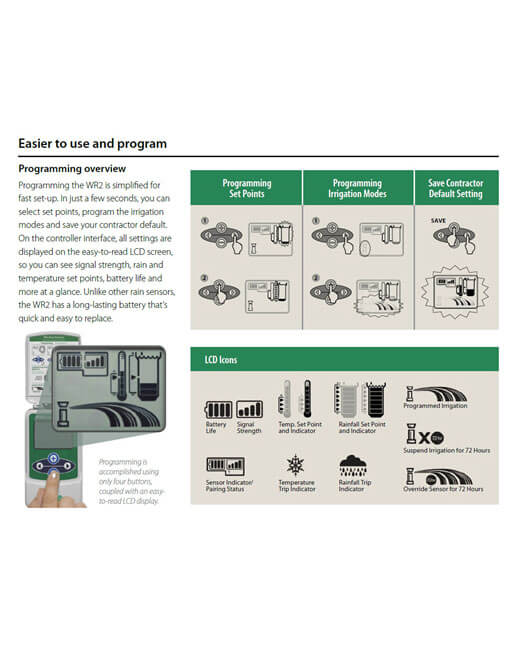 Se trata de un dispositivo inteligente para la cancelación del riego, ya que la lógica de programación del WRS puede suspender el riego cuando la lluvia caída supera una cantidad programada. Del mismo modo, el sensor inalámbrico de lluvia y heladas suspenderá el riego cuando el sistema alcance una temperatura inferior a la temperatura programada.