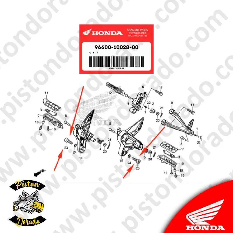 El tornillo de 10×28 mm es un repuesto original Honda diseñado específicamente para asegurar la base de estribo del piloto en la motocicleta CB190R fabricada del 2020 al 2024. Con materiales de alta calidad y la precisión de fabricación de Honda, este tornillo ofrece un ajuste seguro y duradero.